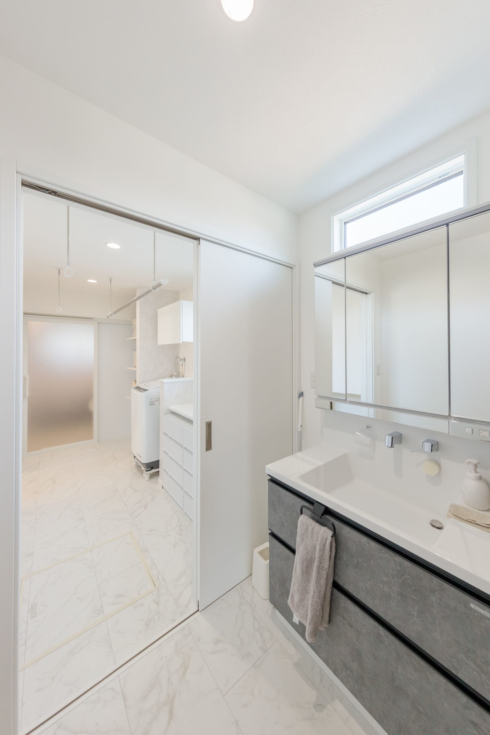 洗面室は、朝の混雑を避けるために幅広の造作洗面カウンターにしました。