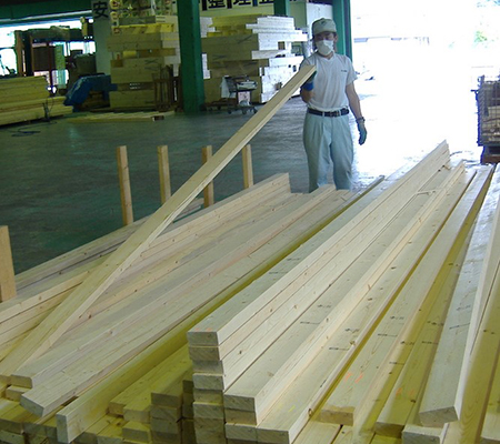 自社で構えていますパネルや釘、ビスなど、建築現場で使う資材はすべてこの工場から出荷されます。よそから運ぶことなく、一括して資材を搬入することで、建築コストの削減にもつながります。