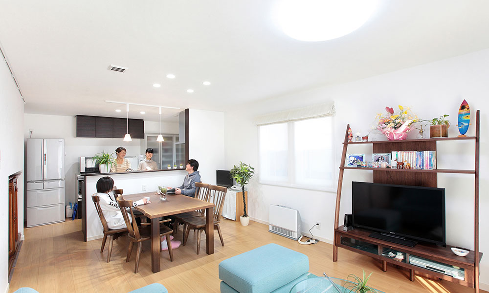 ノースアメリカンをテーマにデザインされたT様邸。持ち込みの家具を置きたいと言ったら、リビングの壁とフラットになるように、収まりよく家具が置ける場所を作る提案をしてくれました。家の中をスッキリさせたいという私たちの気持ちに配慮した提案が嬉しかったです。