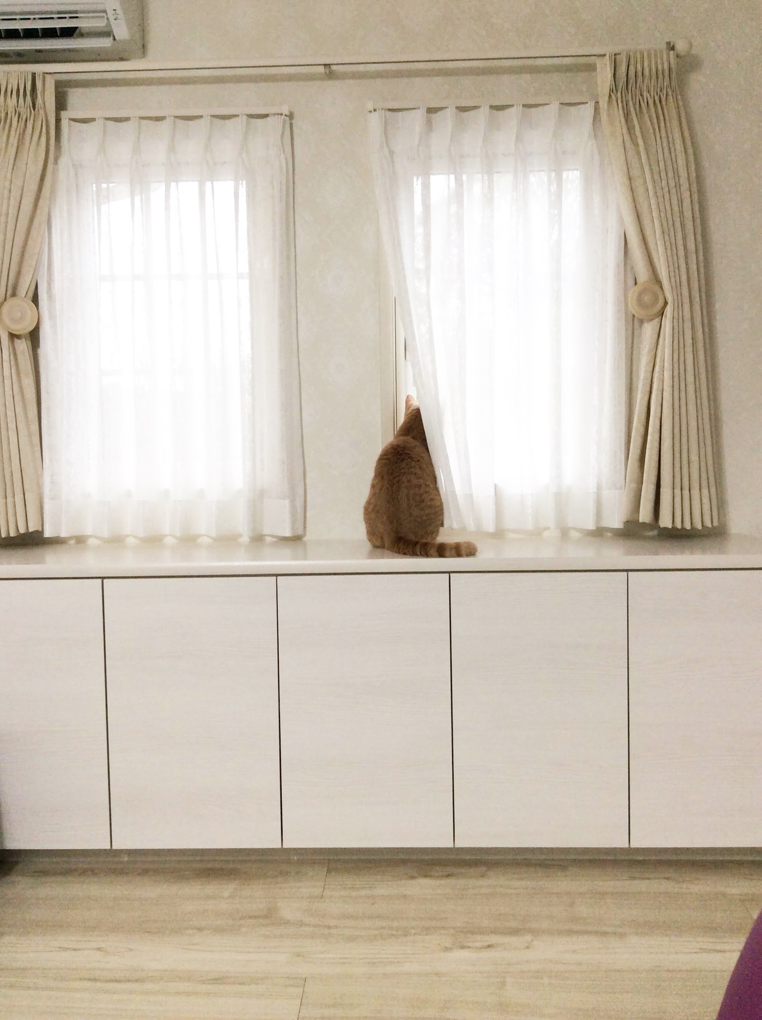 また、リビングの窓下の棚は、日向ぼっこをしたり、窓から外を覗けるようになっているので、愛猫たちのお気に入りのスペースに。共に楽しく暮らせる工夫がいっぱいのお宅でした。