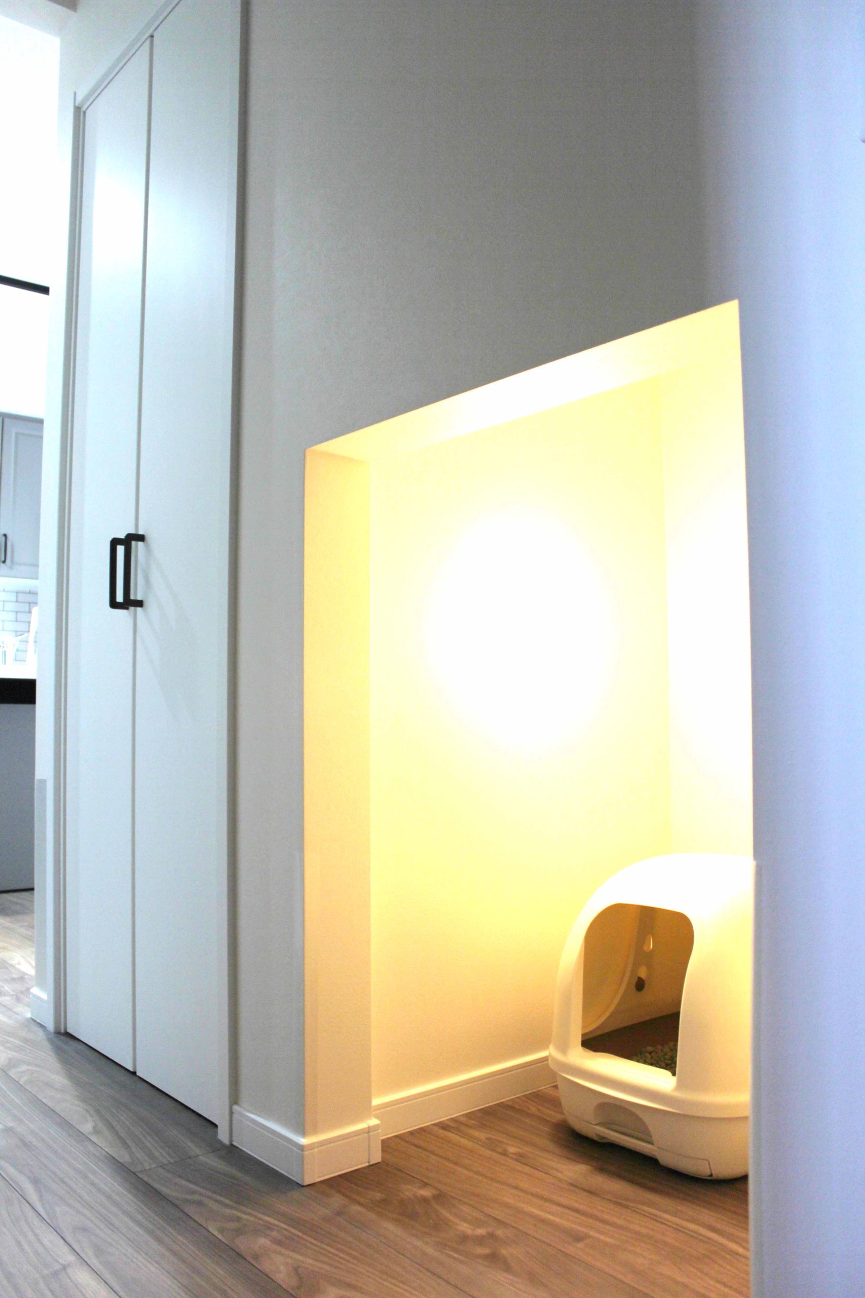 奥様が以前から憧れていたというアイランドキッチンは、マットな色合いと質感で北欧風にまとめ、リビングはキッチンに合わせ、白とグレーでトーンを落とし、差し色として扉を明るいカラー塗装したことでバランスよくまとまっています。 各居室につながる下がり壁はアーチで仕上げ、可愛らしさも忘れません。また、玄関やトイレ、洗面にも好みの壁紙を使用し、遊び心のある心躍る空間になりました。