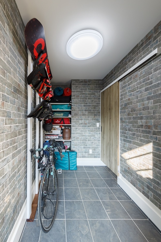 木のぬくもりと暖かな日の光を感じる、ナチュラルな雰囲気でまとめられた大空間のLDKは、上部を勾配天井にすることで開放感を演出。スキップフロアの下には愛犬専用のスペースを設け、S・I・Cからそのまま愛犬専用スペースに行くことができるようになっています。さらに、玄関横には外から直接出入りできる土間収納を配置し、趣味のスノーボード