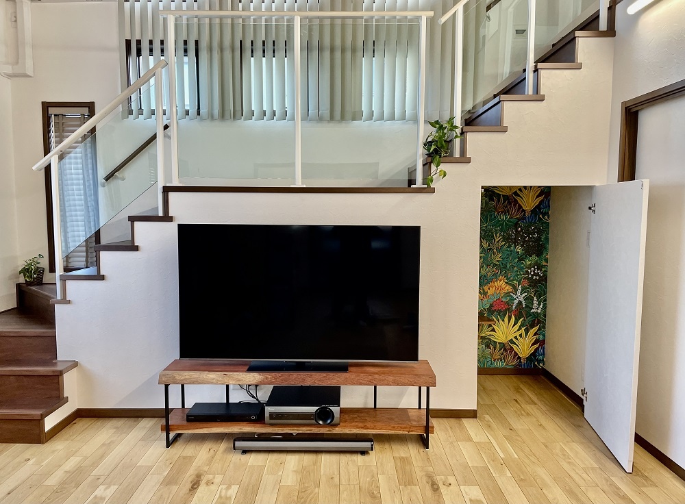 ロフトからはリビング全体が見渡せ、安全性と視認性を意識し、透明なアクリル板の手摺を設置。ロフトの階段下には隠し扉の収納を作り、収納の内部壁紙にもこだわりました。