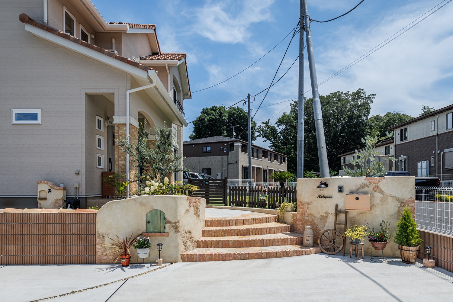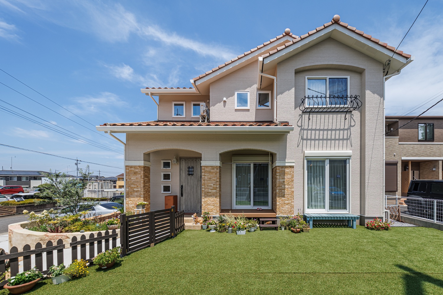 南フランスの街並みを思わせる外観とレンガ調のかわいらしい玄関アプローチで迎えてくれるN様邸。広々とした庭は、お子様や愛犬と一緒に遊べて家族みんなが笑顔になれる場所だといいます。